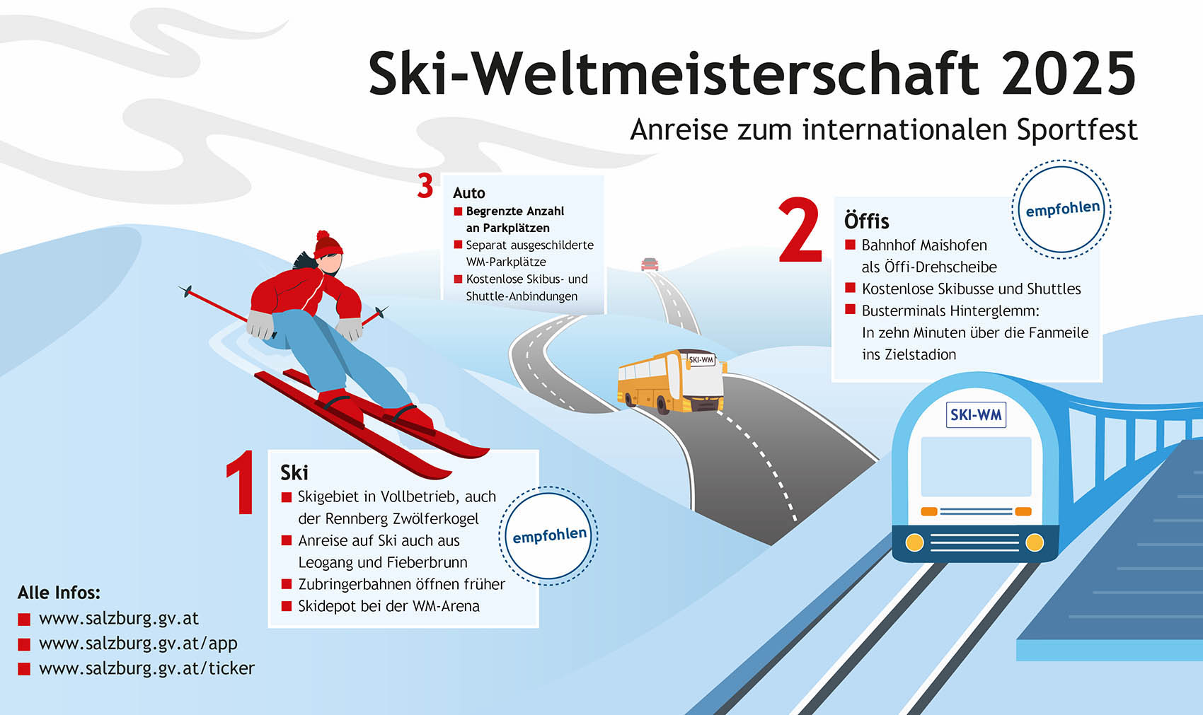 Bund, Land und Gemeinde haben gemeinsam rund 50 Millionen Euro in die Infrastruktur rund um die Ski-WM investiert. Besonderer Fokus lag und liegt dabei auf Maßnahmen, die auch danach die Region aufwerten. Unter anderem entstanden so ein barrierefreies Hinterglemmer Ortszentrum, ein Weg für Einsatzkräfte, der danach zum modernen Geh- und Radweg wird, neue Busterminals zur Stärkung des öffentlichen Verkehrs und ein Pressezentrum, das der Bevölkerung als Freizeitzentrum zur Verfügung stehen wird. Auch in die Sicherheit der Rennläufer wurde mit effizienter Beschneiung investiert, auch diese bleibt den Einheimischen und Gästen danach erhalten. Dazu kommt der neue Bahnhof Maishofen und auch die neue Zwölfer-Nord-Bahn von den Hinterglemmer Bergbahnen.